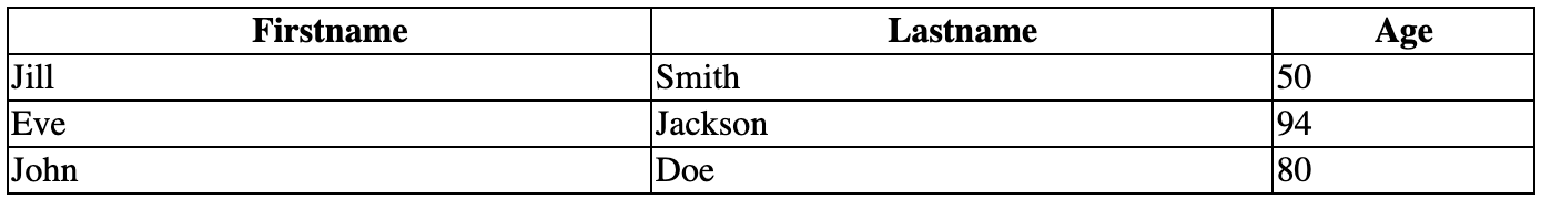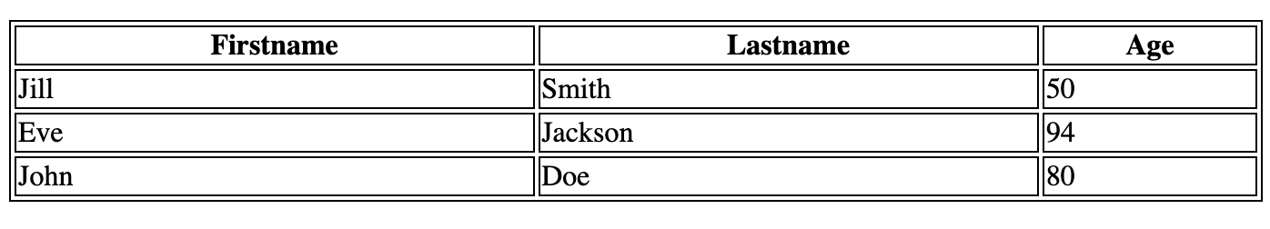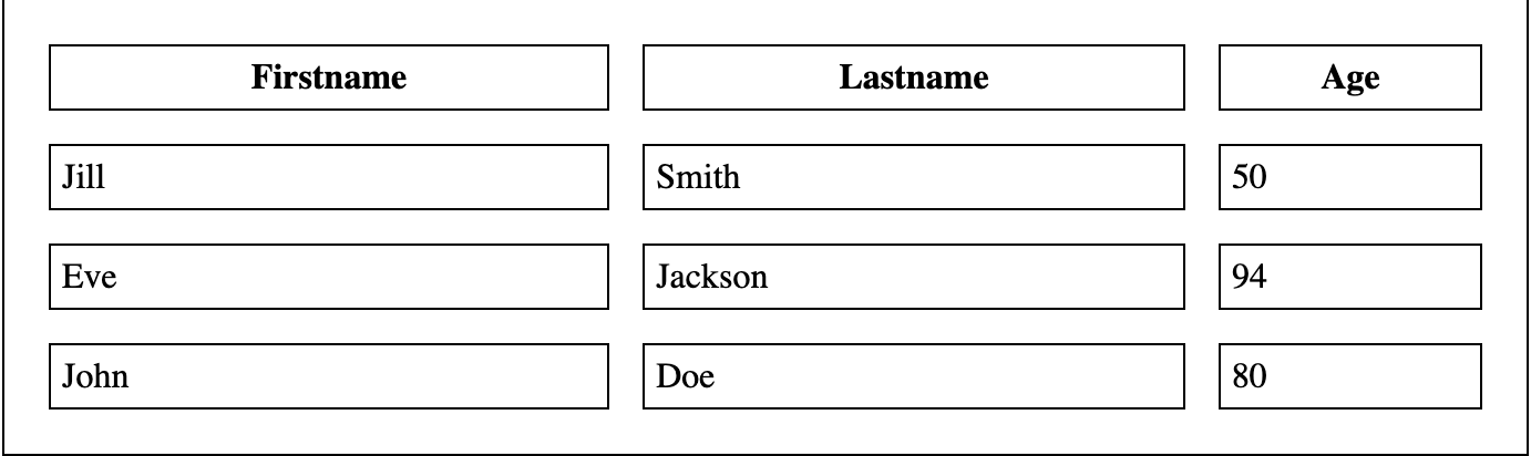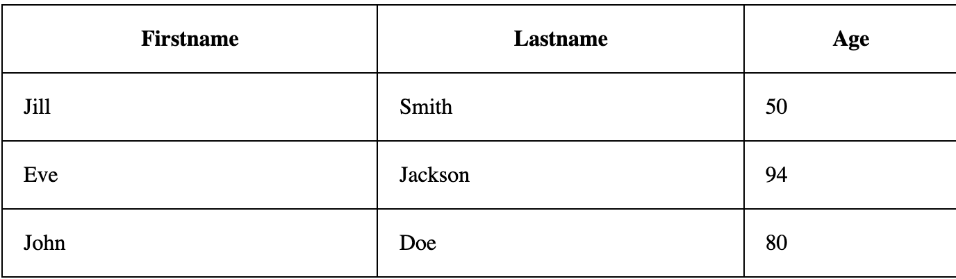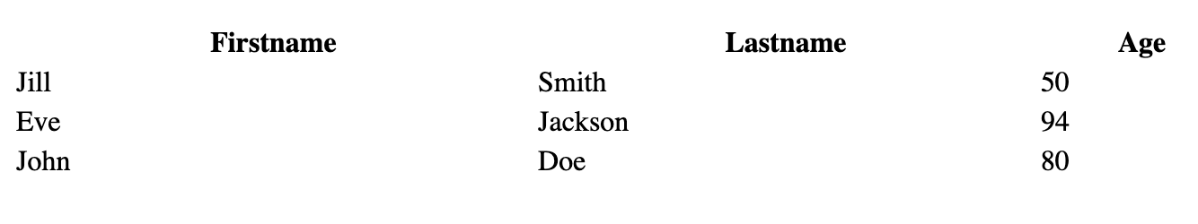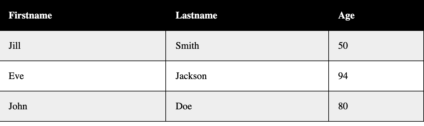 각 테이블 행은 <tr>태그 로 정의됩니다 . 각 테이블 헤더는 <th>태그 로 정의됩니다 . 각 테이블 데이터/셀은 <td>태그 로 정의됩니다 .