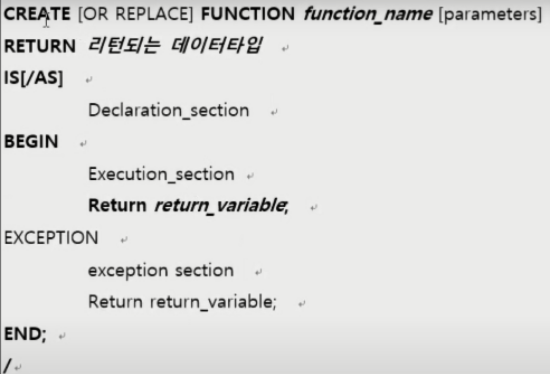 - 함수 Header에 리턴되는 데이터 타입을 기술해야 하고 Header의 끝에는 IS[AS]가 와야하고 IS[AS]와 Begin사이에 Begin~End에서 사용할 변수를 선언한다.