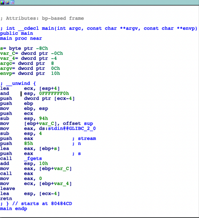 다음과 같은 main 부분이 나온다. S 라는 문자형 데이터가 존재하고 v5 라는 포인터와 fgets 를 이용해 133byte 까지 받도록 하는 것이 가장 눈에 띈다.