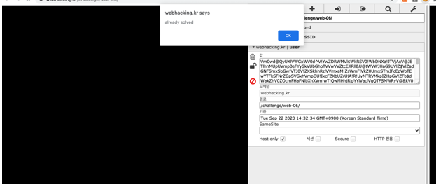 고찰: 처음하는 웹해킹이라서 마지막 if문만 보고 때려맞춘?감이 없지않아있는데 encoding과 decoding에 대한 정의를 알고 그걸 editthiscookie를 이용해 쿠키값을 조정하면서 문제를 푸는것이 재밌었다. 사실 Python을 이용해서 20번 인코딩하려고 했지만… 실패….에헴…