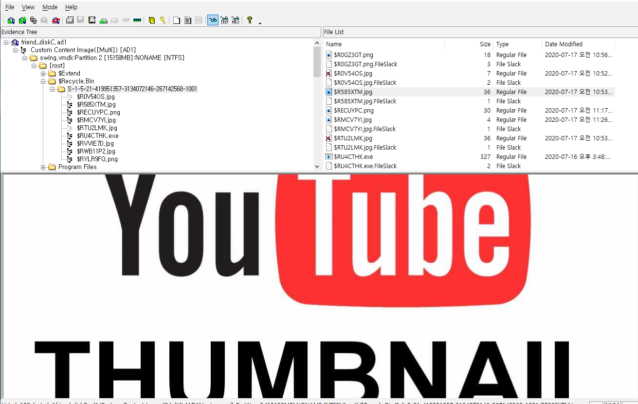 문제에서 실수로 중요한 사진들을 지웠다고 했으니까 휴지통에 파일이 들어가 있을 확률이 있어 root/Recycle.Bin/에서 휴지통에 있는 항목들을 살펴본다.